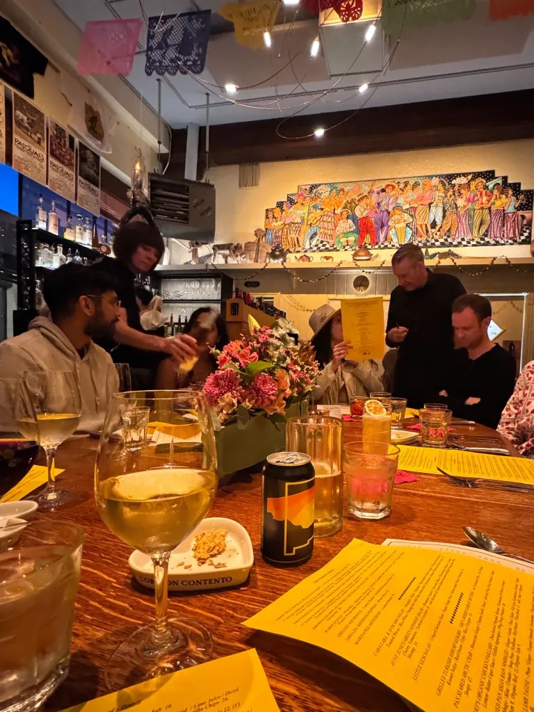 La Reina (at El Rey Court). Tucked into El Rey Court, La Reina describes itself as an “airy mezcal and tequila-focused bar”. I found it to be more intimate than it let on. All seats at the bar were occupied when we arrived around 7:00 PM for a pre-dinner drink. Against my better intentions not to start the evening with mezcal… we are at a mezcal bar. I had the Root Word – amaro, grapefruit, Rey Campero Espadín, lemon, and demerara. It leaned smoky to start and citrusy to finish.
